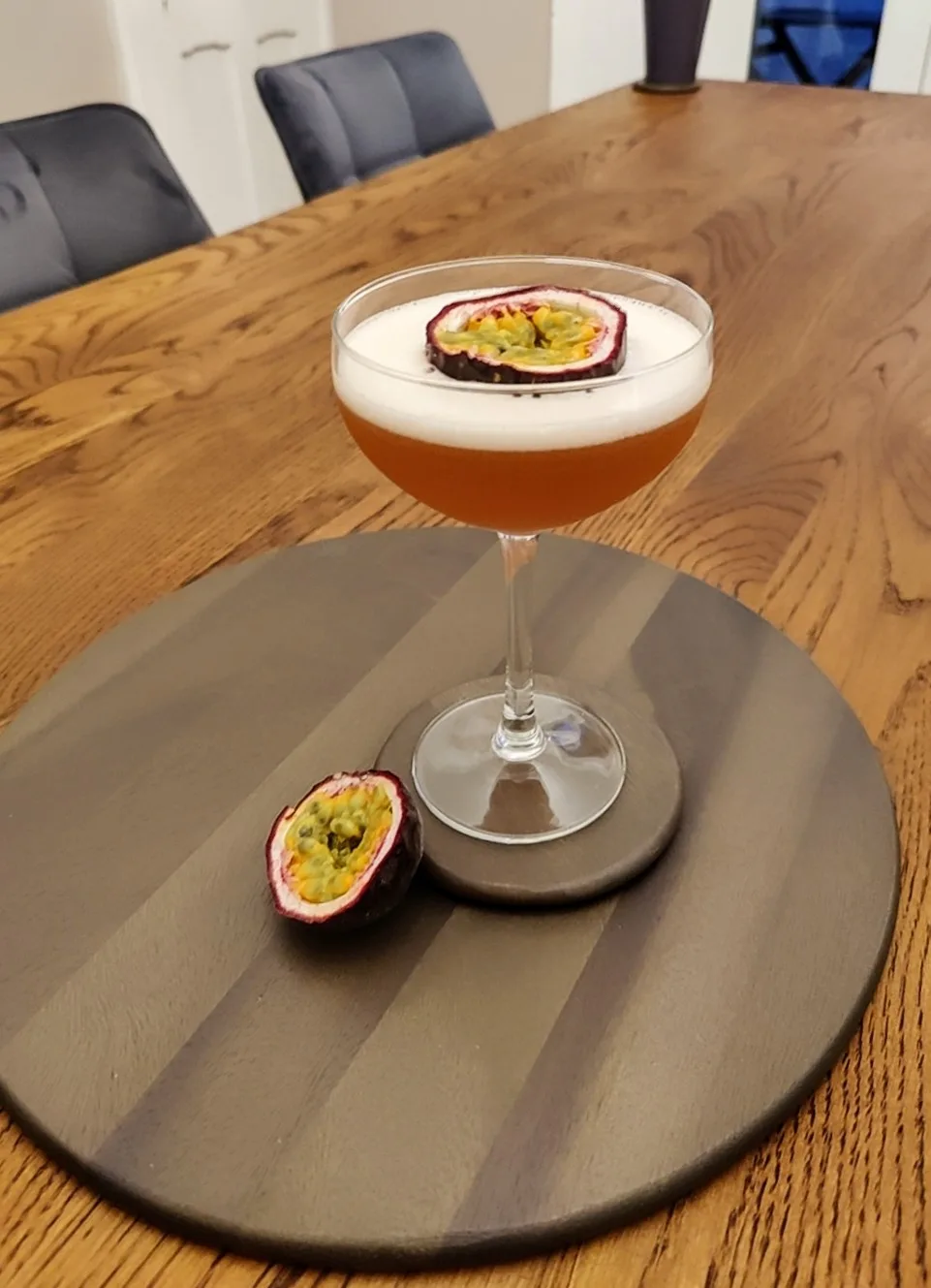 - Double strain in to a Martini glass and top up with the Prosecco and then top with a Passion Fruit halve.